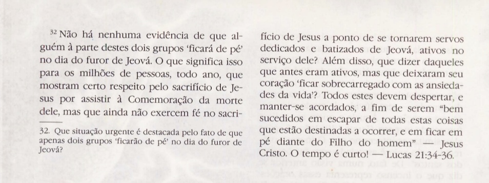 Além disso, o próprio livro afirma que para fazer parte desse grupo a pessoa precisa ser um Testemunha de Jeová batizada e aprovada. (Os "fracos" — coitados — ao contrário da ovelha perdida e em apuros que a Bíblia diz que o Mestre vai atrás para ajudar, correm, segundo o livro, o risco de não serem aprovados.)