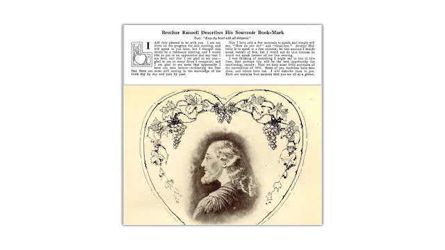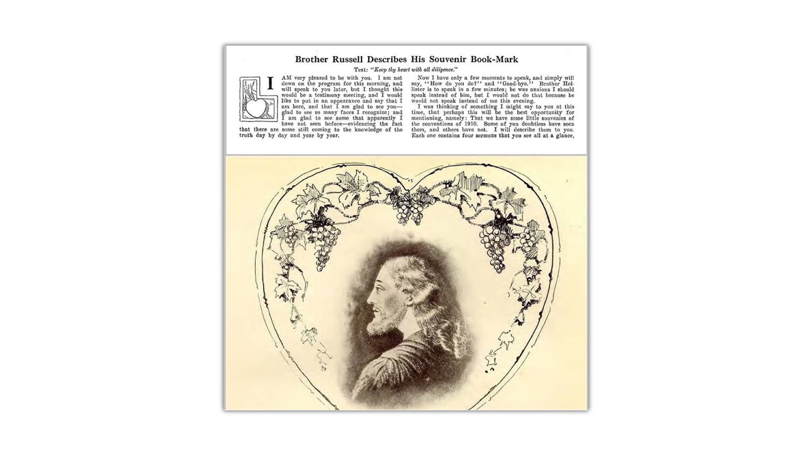 Esse pequeno marcador em forma de coração foi dado gratuitamente a todos os presentes na Convenção Internacional dos Estudantes da Bíblia, realizada em Chicago em 1910 e, posteriormente, a todos aqueles que o solicitaram. De acordo com o livreto em inglês “Souvenir Convention Report”, esses marcadores foram desenhados pelo irmão Russell, que explicou o significado dizendo: “Eles são finos, como papel, feitos de celulóide, cortados em forma de coração e depois de cada lado. Por um lado, há uma coroa de flores ‘Não se esqueças de mim’. E isso lembrará você de não se esquecer do Senhor e de todos os seus benefícios… Então vire o coração de cabeça e do outro lado há uma videira que se ramifica em torno dos lados do coração, nos fazendo lembrar de João 15. Veja os grandes cachos de uvas, eles representam o grande fruto do Senhor Jesus, que você e eu devemos copiar, mesmo se não esperamos dar frutos como ele… Sob a figura do Senhor, há o texto bíblico que todos podem aplicar ao coração e à vida: “Guarda o teu coração, porque dele procedem as fontes da vida”… o Senhor julgará nosso coração pelos nossos esforços. Portanto, guarde seu coração com toda a diligência…”