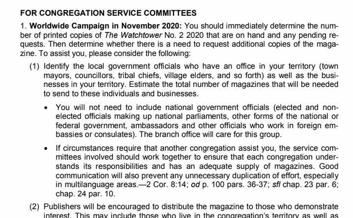 Recentemente circulou nos fóruns de ex-Testemunhas de Jeová, em inglês, a seguinte carta aos anciãos com orientações de uma nova “campanha mundial”: